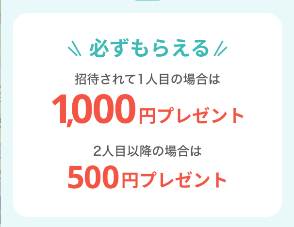 紹介キャンペーンを利用して始めるだけで、1,000円が無料でもらえてお得です。(2人目以降は500円)