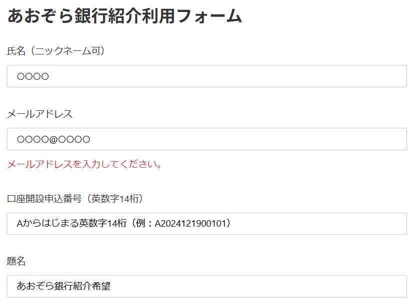 あおぞら銀行紹介利用フォームから自分の名前(ニックネーム可)とメールアドレス、口座開設申込番号、あおぞら銀行の紹介である旨を記載して送信。