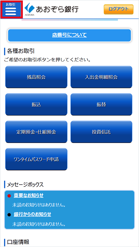 あおぞら銀行のインターネットバンキングにログインして画面左上のお取引メニューをタップ。