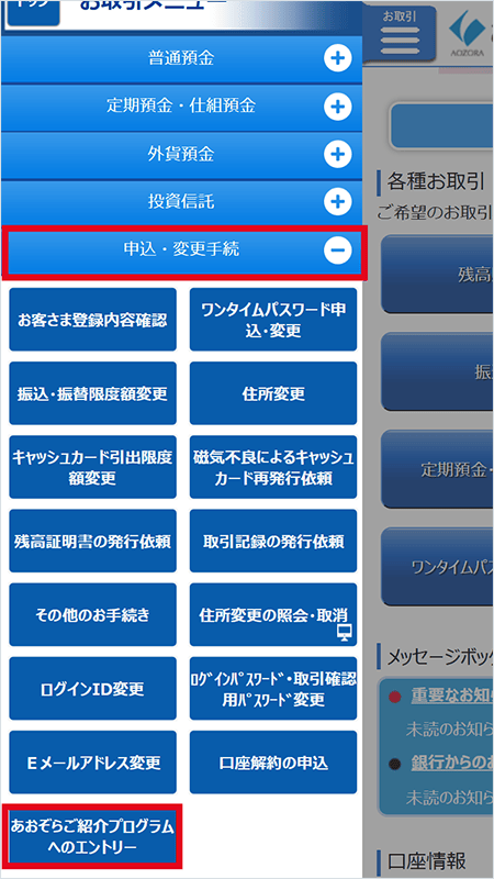 「申込・変更手続」をタップし、「あおぞらご紹介プログラムへのエントリー」を選択します。