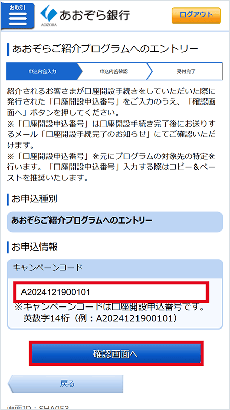 紹介される方の「口座開設申込番号」を入力し、確認画面へ。