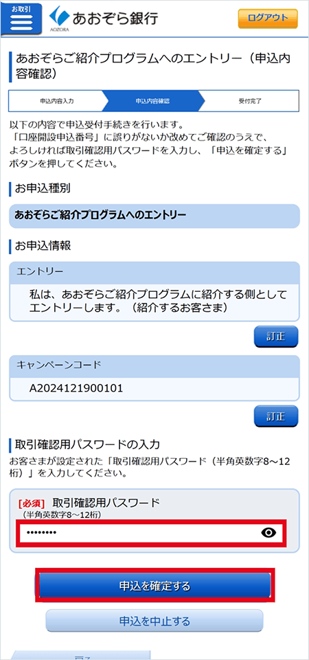 入力内容を確認のうえ、取引確認用パスワードを入力し、「申込を確定する」をタップ。