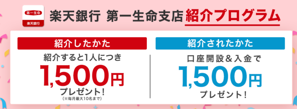 今回は楽天銀行 第一生命支店 の紹介キャンペーンについて解説しました。